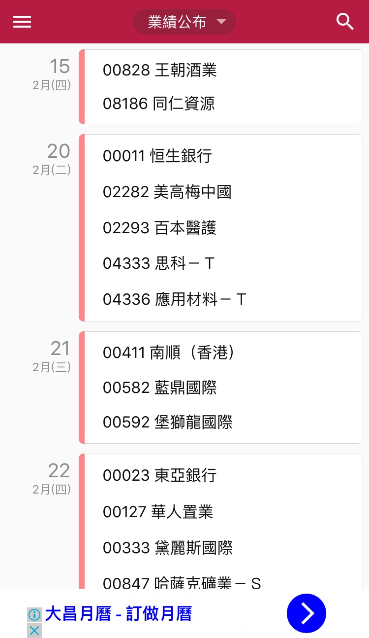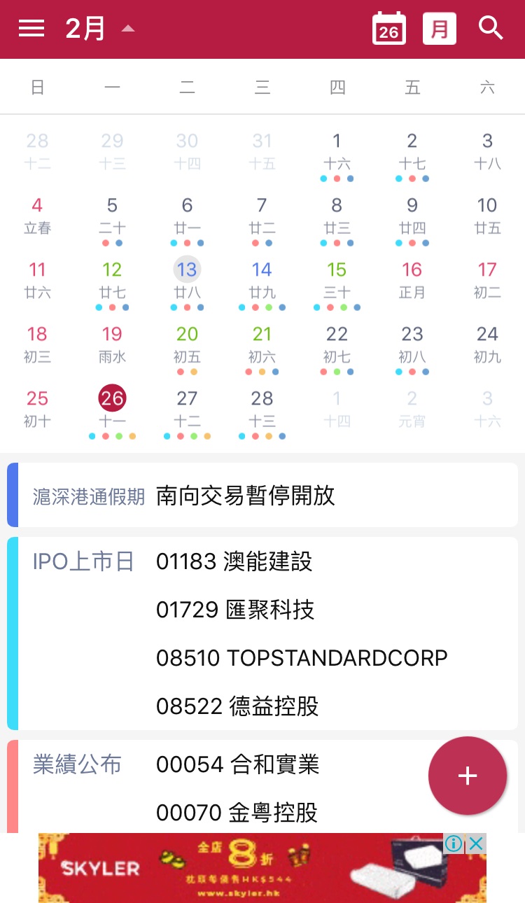 ![]() etnet財曆, 除提供香港、中國、美國公眾假期、中國農曆及節氣資訊外,重點功能為清晰標示香港交易所全年的重要活動事項,讓你隨時掌握金融交易市場的重大事件。 介面操作簡易,可自由切換年或月顯示模式,更設列表模式可於同一畫面內顯示有關公眾假期及香港交易所重要活動事項,所有資訊一目了然。