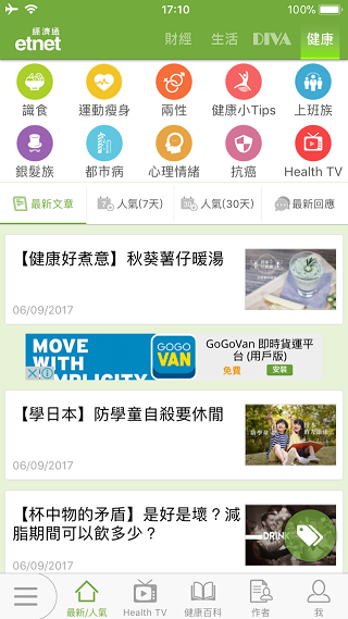 ![]() 【etnet財經‧生活App榮獲The Spark Awards 2016 Best App金獎】 涵蓋理財、管理、世事政情、健康養生、消閒購物、數碼科技等資訊,盡享健康樂活之道。 【DIVA】頻道 – 知性‧潮流 以Fashion、Beauty & Love、Watch & Jewelry、 Art & Culture及 Travel & Dining五大品味內容集於一站。專題訪問、歐日韓潮流前瞻、本地潮界資訊及品位名家專欄等,日日更新,秒秒矚目。 【健康好人生】頻道 –健康‧養生 豐富內容包括養生食療、都市病、抗癌、運動瘦身、兩性關係、健康小Tips,編輯團隊更自家製作Health TV,透過視頻傳送健康資訊,全方位打造健康好人生! ![]() ![]() ![]() ![]() |