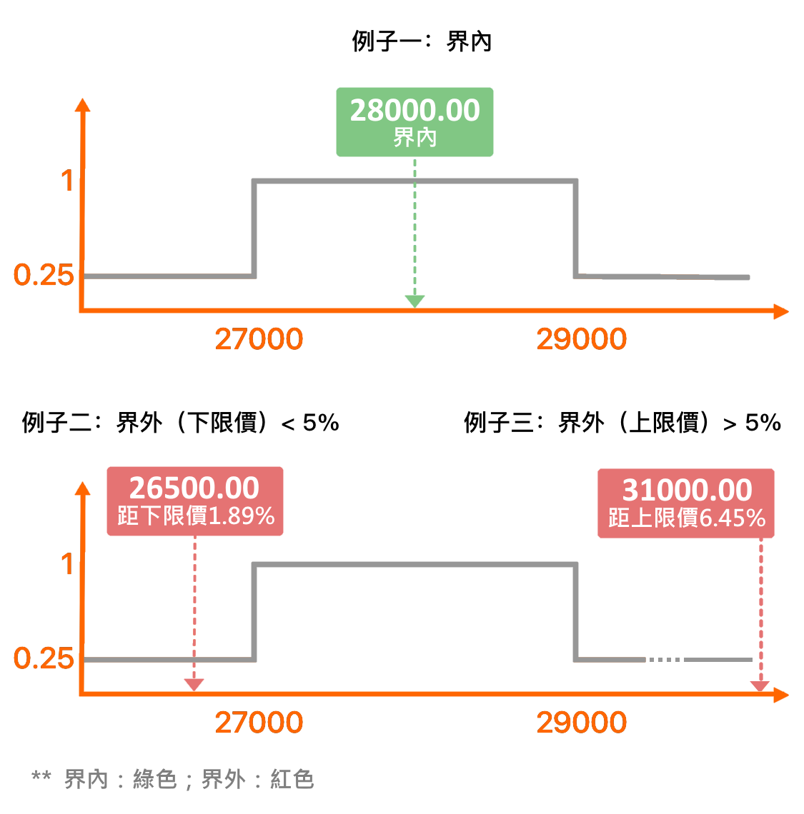 如上圖所示,假設某恒生指數界內證上限價: 29,000點 及 下限價: 27,000點